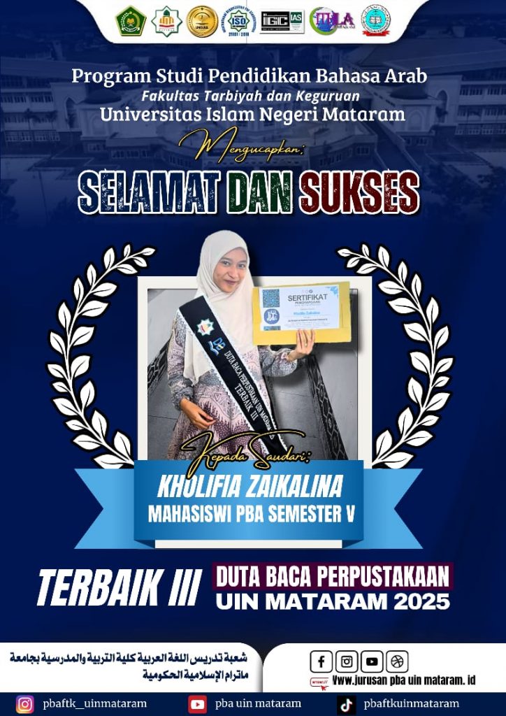 Program Studi Pendidikan Bahasa Arab (PBA) Fakultas Tarbiyah dan Keguruan Universitas Islam Negeri Mataram kembali menorehkan prestasi membanggakan pada tahun 2025. Salah satu mahasiswi terbaiknya, Kholifia Zaikalina, yang saat ini duduk di Semester V, berhasil meraih gelar Terbaik III Duta Baca Perpustakaan UIN Mataram 2025. Prestasi itu diumumkan bersamaan dengan rangkaian kegiatan promosi literasi kampus yang digelar oleh Perpustakaan UIN Mataram.